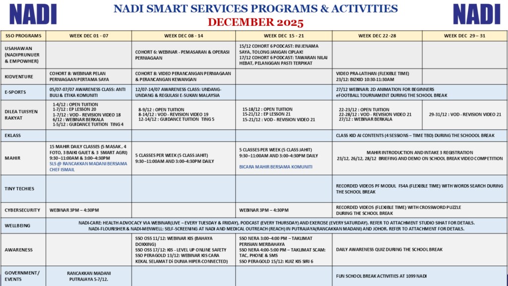 Berikut merupakan jadual perancangan aktiviti yang akan dijalankan sepanjang bulan Disember 2025 di NADI Felda Bukit Cherakah. Semua penduduk dijemput hadir untuk memanfaatkan pelbagai program pembangunan ilmu, kemahiran dan kesejahteraan komuniti